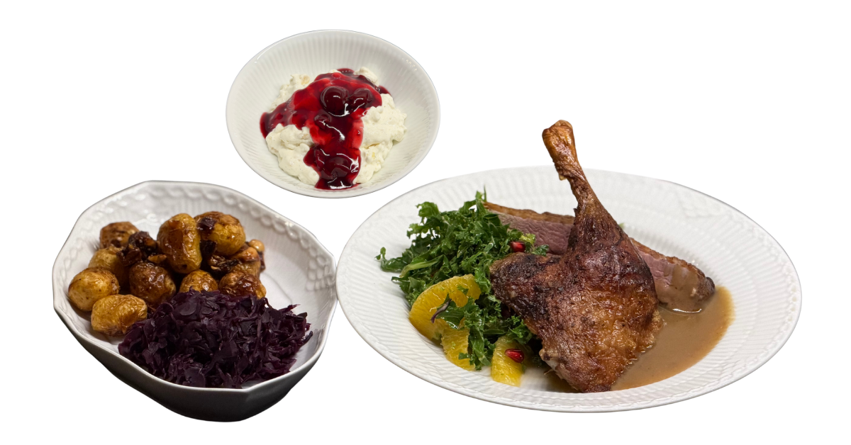 Stegt andebryst og confiteret andelår serveret med kogt rødkål, grønkålssalat med granatæble, andesauce og små kartofler vendt i honning og nødder